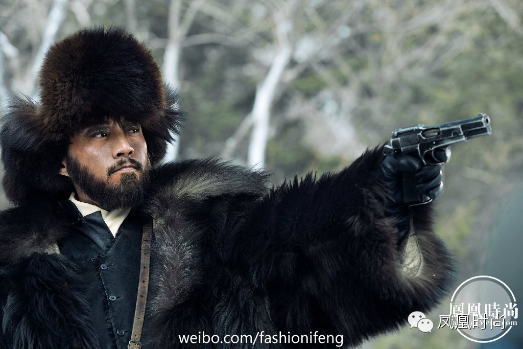 韩庚在片中的造型并不像杨子荣和座山雕那样大面积的运用皮草,而是点缀式的。这种皮草的点缀不仅可以防寒保暖也增加了时尚感。