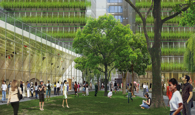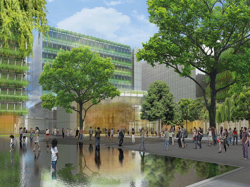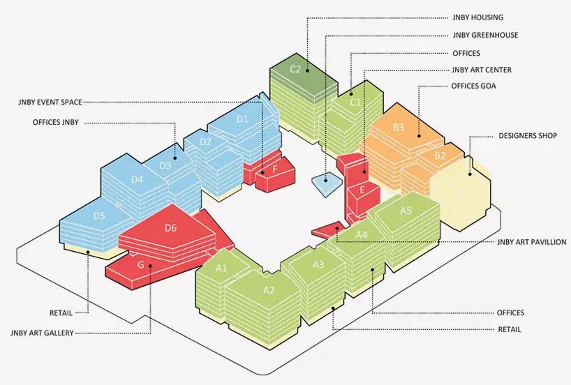 园区以一个敞开性的广场为基地,广场上有有些蓄水构造,行人可涉浅水而行。园区内单位和零售店门口面向广场敞开,鼓舞职工走出单位,一起在窗边能够看见葱郁的绿色景象。不过这个规划最好悉数选用常青植物,否则在冬季大楼景象会让人感到异常萧条。