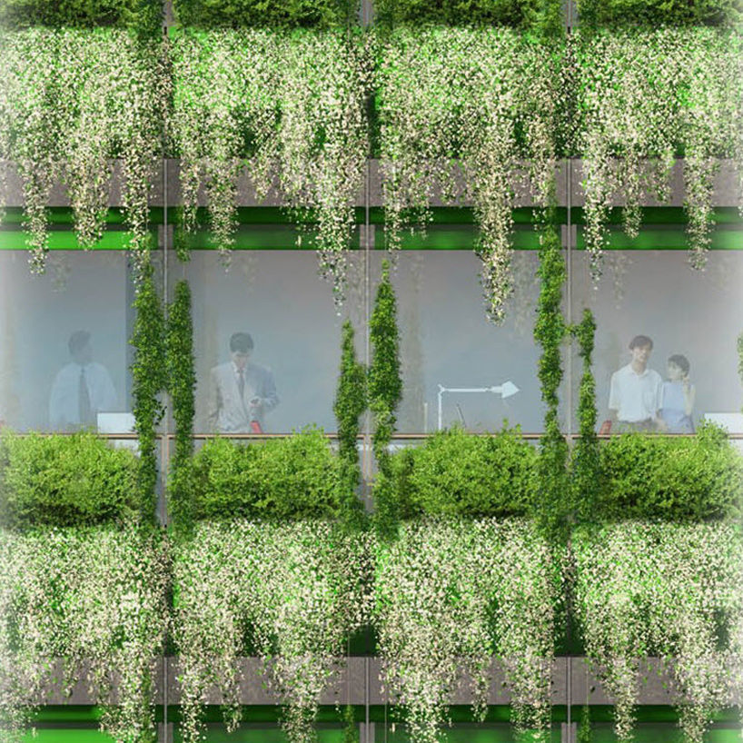园区内部进行了大规模的美化作业,而杭州的气候利于藤蔓植物的成长,使用这一优势,规划师在修建物的墙壁上栽培了很多藤蔓植物,经过修剪成型,避免了修建物外观不一致带来地视觉紊乱。
