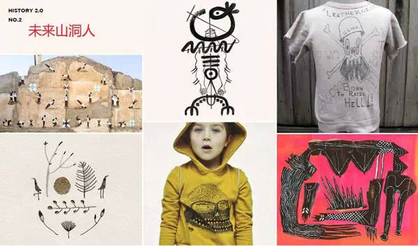 人类起源之初启发了更加黑暗且更加原始的插画印花趋势的产生。山洞人风格的野生涂鸦和潦草的字母图案启发了自由形态的时尚前卫印花趋势的产生,适用于定位图案和风俗画印花的设计之中。